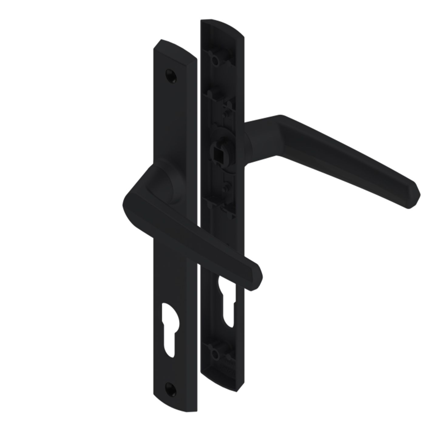 These are used on the active door of either single or double doors. The outside furniture has no visible screws, a cylinder hole and the handle operates the latch on the lock. The inside furniture has visible screw fixings, a cylinder hole and the handle operates the latch on the lock. Handles operate bolts when used with a compatible multi point lock.